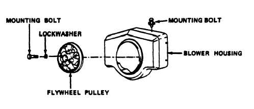1 Remove two flywheel pulley mounting bolts and two lockwashers. Remove flywheel pulley.