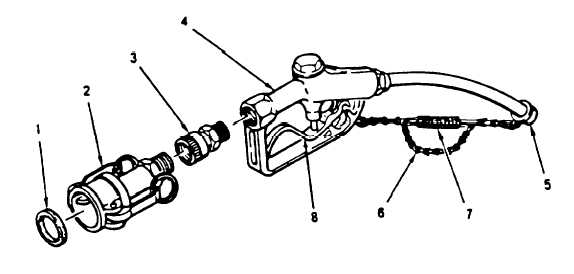 d. Inspect control handle (8), female quick-disconnect reducer (2), or swivel (3).